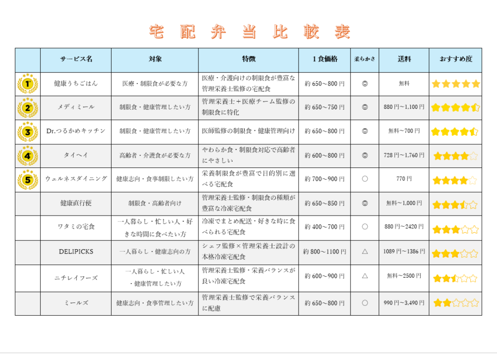 そんな方のために、本記事では人気の宅配弁当サービスを比較表をもとに分かりやすく解説します。